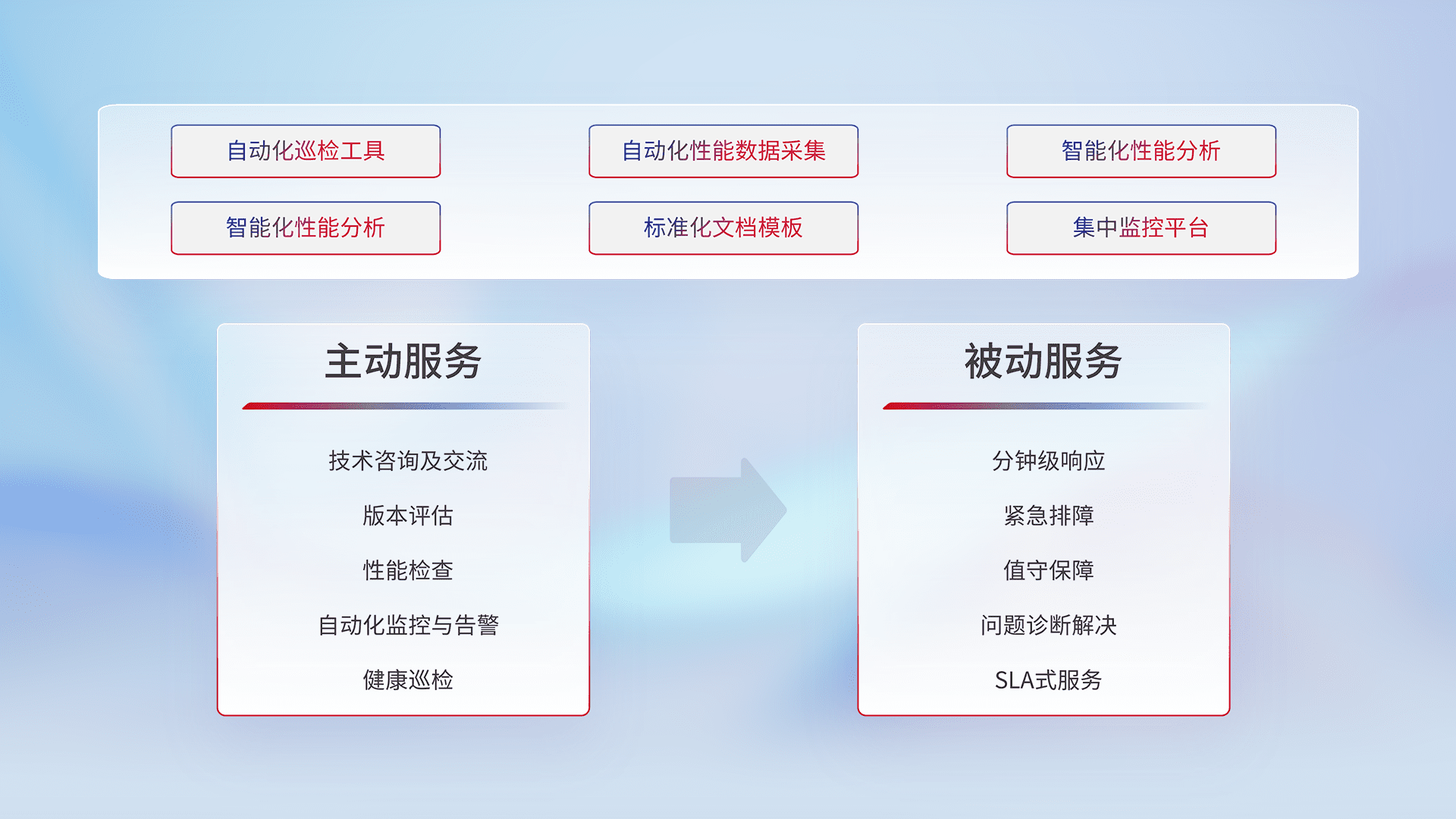 智能化工具和标准化文档,,,,保障服务质量,,,,提供主动服务(包含技术咨询、、、、版本评估、、、性能检查、、、自动化监控与告警、、健康巡检)和被动服务包含(分钟级响应、、、紧急排障、、、、值守保障、、、、问题诊断解决、、、、SLA服务)。。。