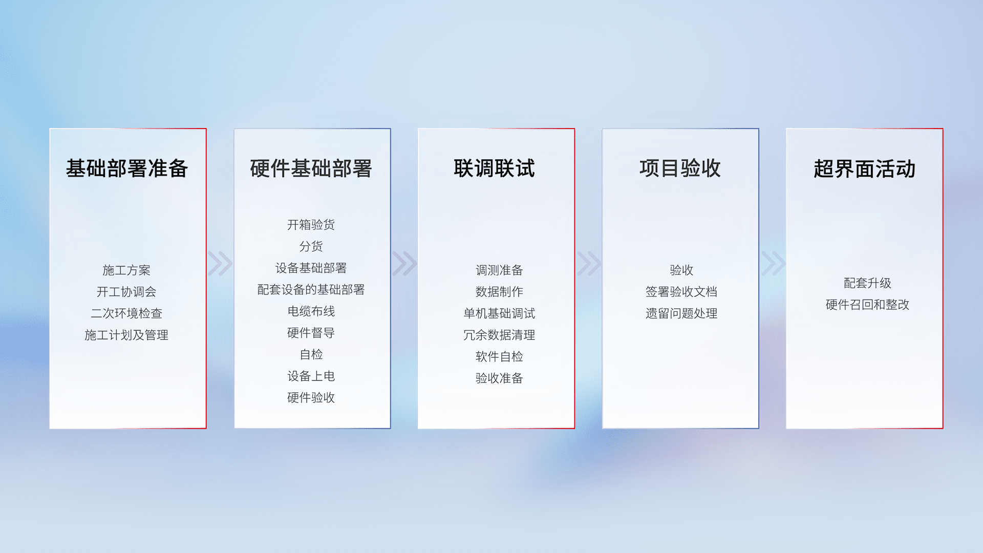 从基础部署准备、、、硬件基础部署、、联调联试、、项目验收、、、越界面活动的全过程可追溯,,,,保证施工质量和进度。。